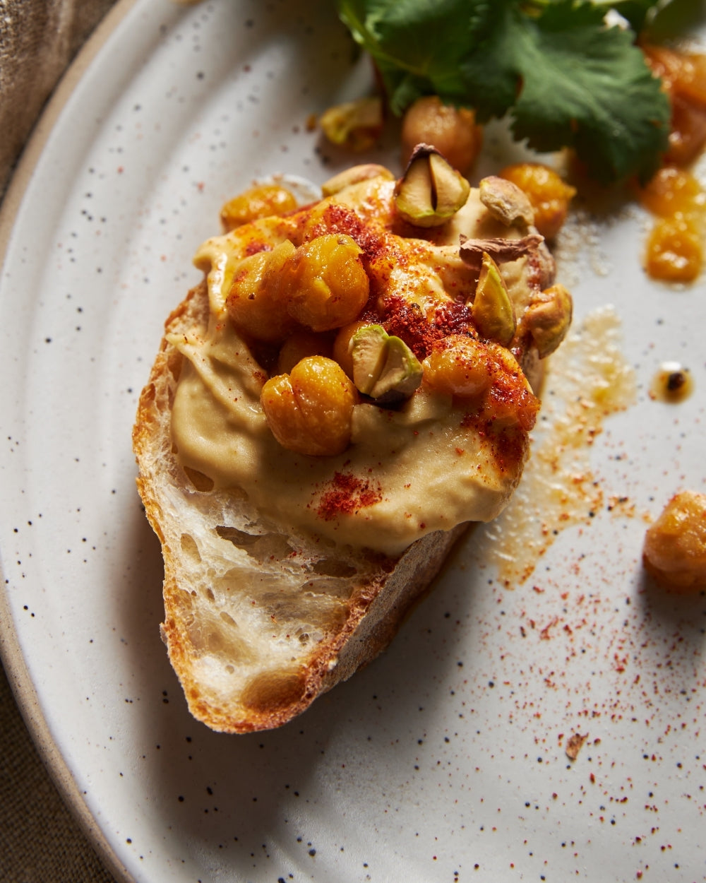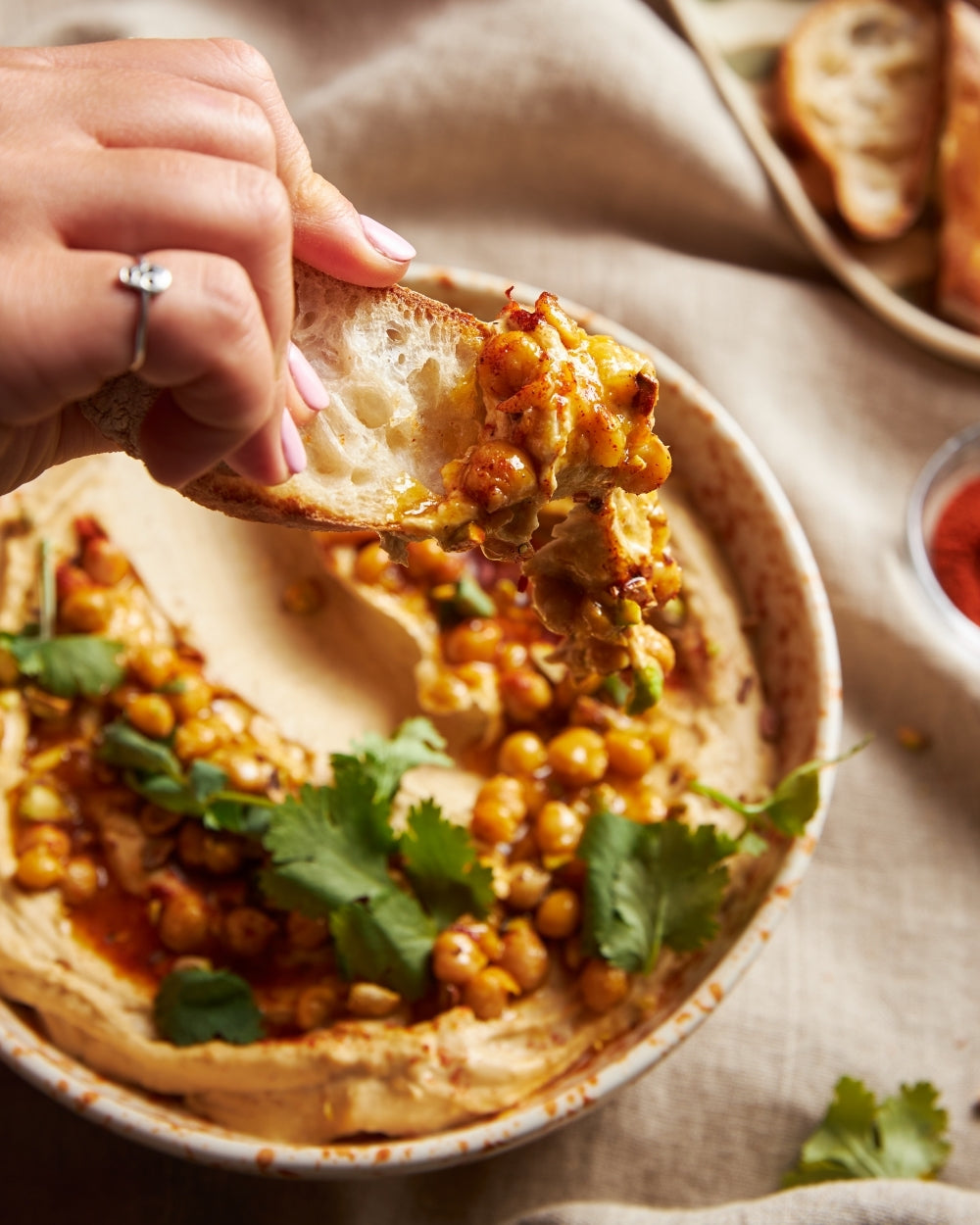 Seek out the best brand of hummus you know. Bring 500g of it to room temp. Pile into serving dish. Grab a 400g can chickpeas. Drain. Rinse. Next, heat ⅓ cup extra virgin olive oil over medium heat in a medium-ish frying pan. Chuck in chickpeas. Follow up with 2 cloves of crushed garlic. A good slug of harissa (3-4 tsp, or to taste). Squeeze half a lemon in there. Season. Mix. Heat through. Spoon over your hummus. Scatter with coriander (cilantro) if you’re a lover not a hater. Chopped pistachios. A sprinkling of smoked paprika. And done. Serve with breads for dipping.