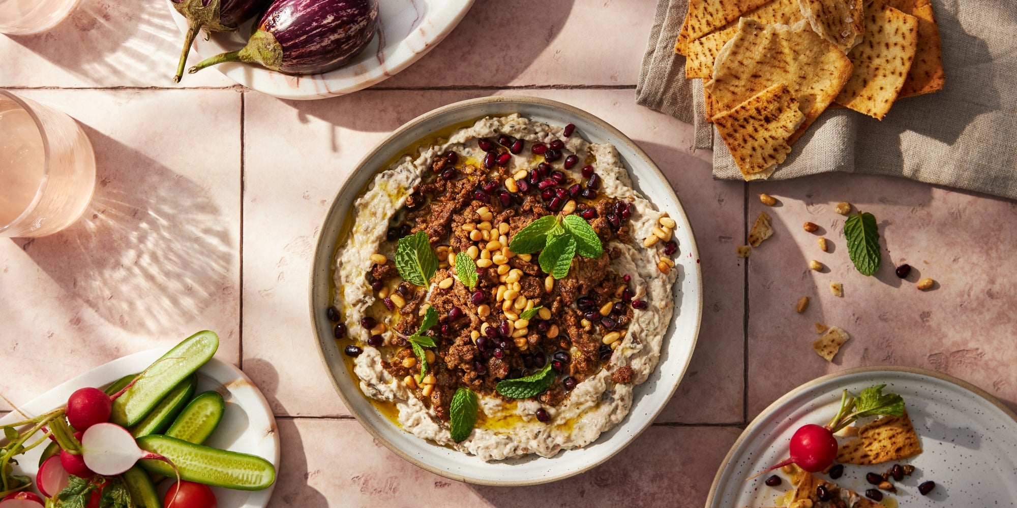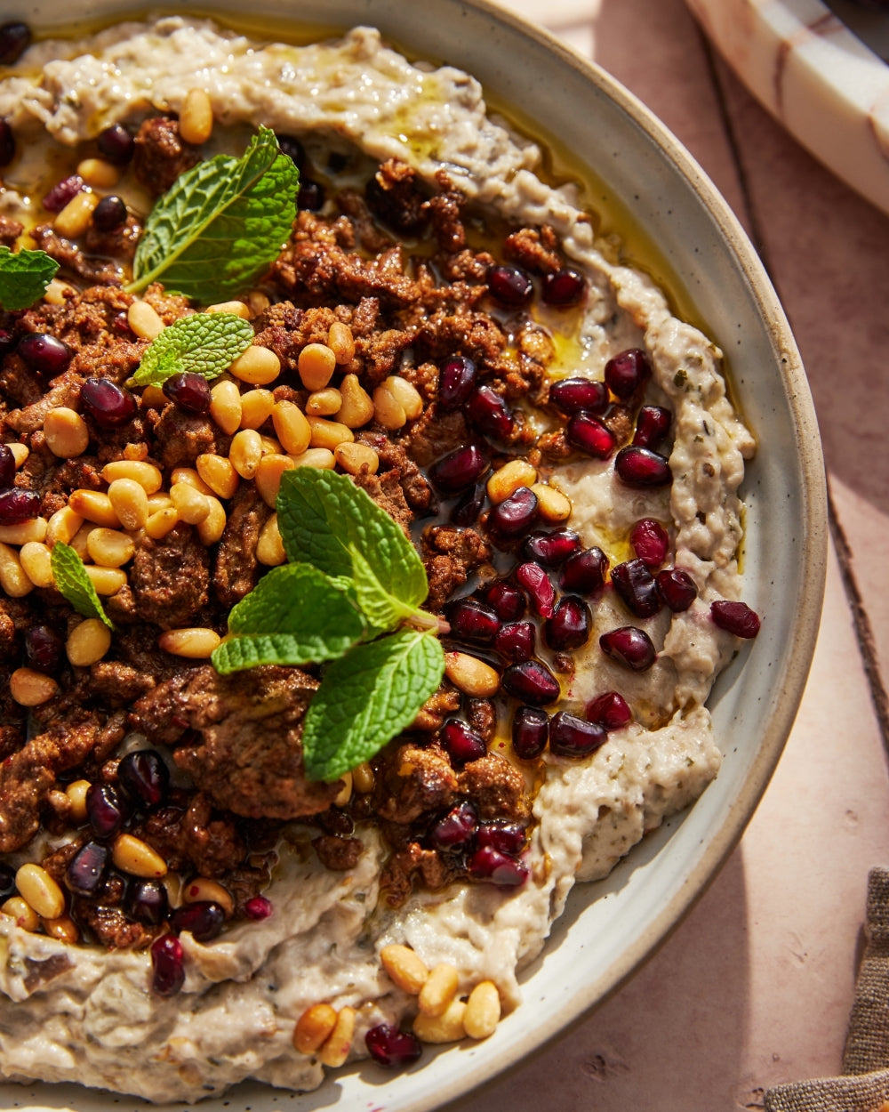 Take a wok or large frying pan. Crank up heat to high. Get pan scary hot. Add in 1 tbsp olive oil. 300g lamb or beef mince. Spread meat out into even layer. Then LEAVE IT ALONE. For about 5 mins. You want char. You want caramelisation. You want it to smell like burgers. Flip. Sear. Cook until golden and a bit crispy. Turn off heat. Now it’s spice time. Stir in 1 tsp each of ground cumin. Dried chilli flakes. Smoked paprika. Chuck in ¼ tsp ground allspice. Taste it. Season it. Scoop 750g baba ganoush into a bowl. Scatter with meat mixture. Some toasted pine nuts. Seeds from half a pomegranate. Mint leaves. Stand back and admire your work. Now get stuck in.