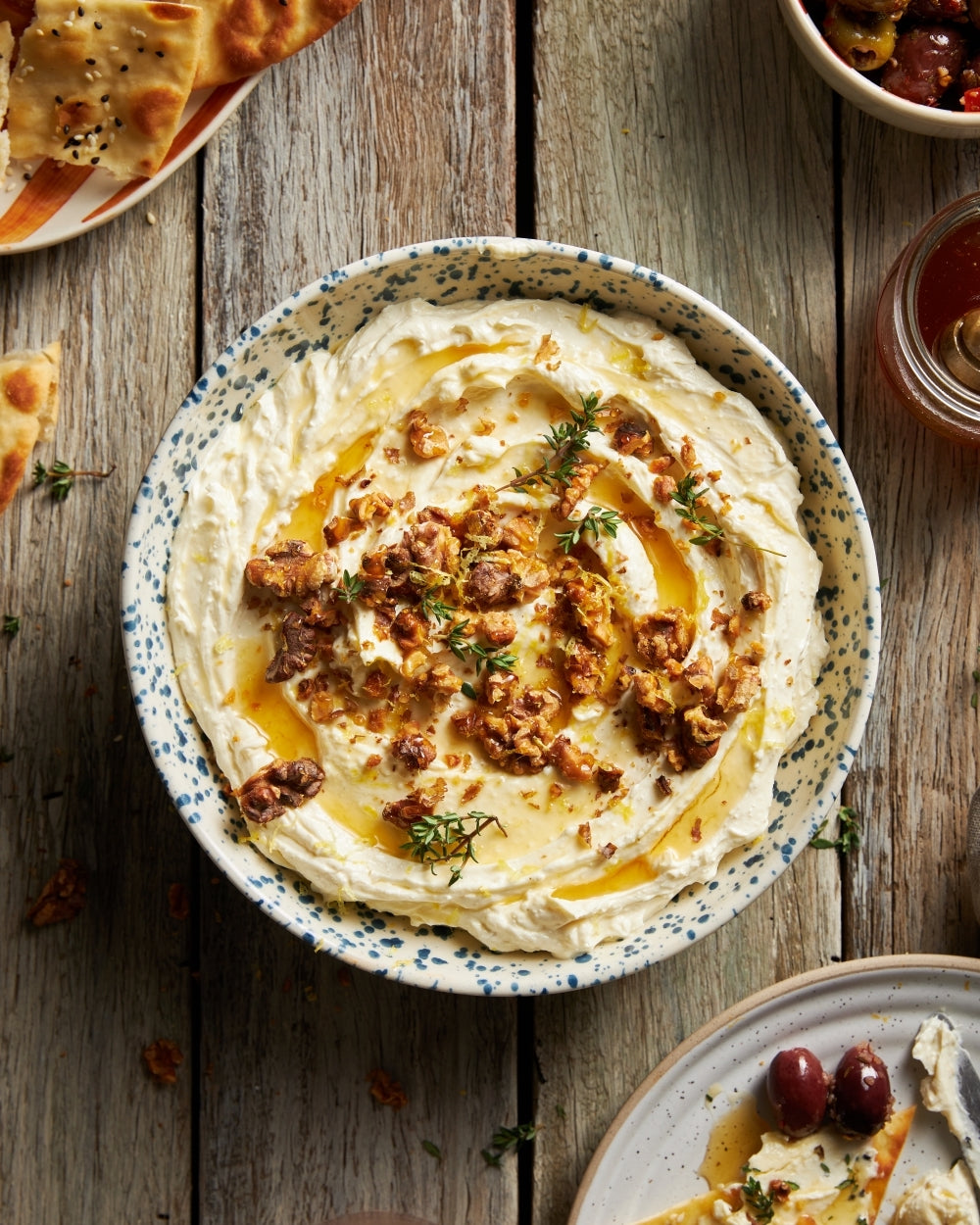 Set up food processor. Crumble in 100g cream cheese. Whack in 200g Danish-style feta. Slosh in 2 tbsp extra virgin olive oil. Add 1 tsp finely grated lemon zest. Squoosh in 3 tsp lemon juice. Chuck in 2 cloves crushed garlic. Whizz until silky smooth. Season. Taste. More lemon juice? You do you. Pile into a bowl. Smash up some toasted walnuts. Adorn your dip with them. Take it to fancy heights with fresh thyme sprigs. A drizz of honey. Job done.
